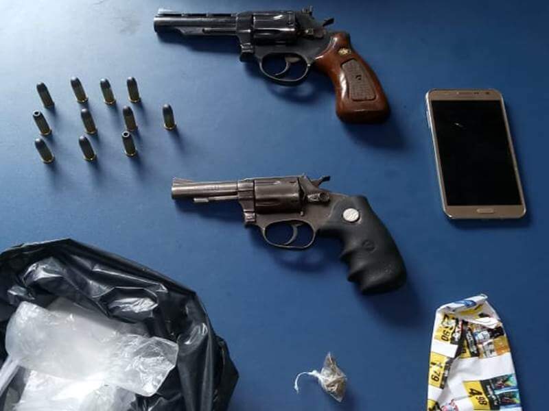Dentro de uma mochila foram localizados dois revólveres calibre 38 e onze cartuchos intactos de munições. Os irmãos entraram em contradição para explicarem a origem das armas.