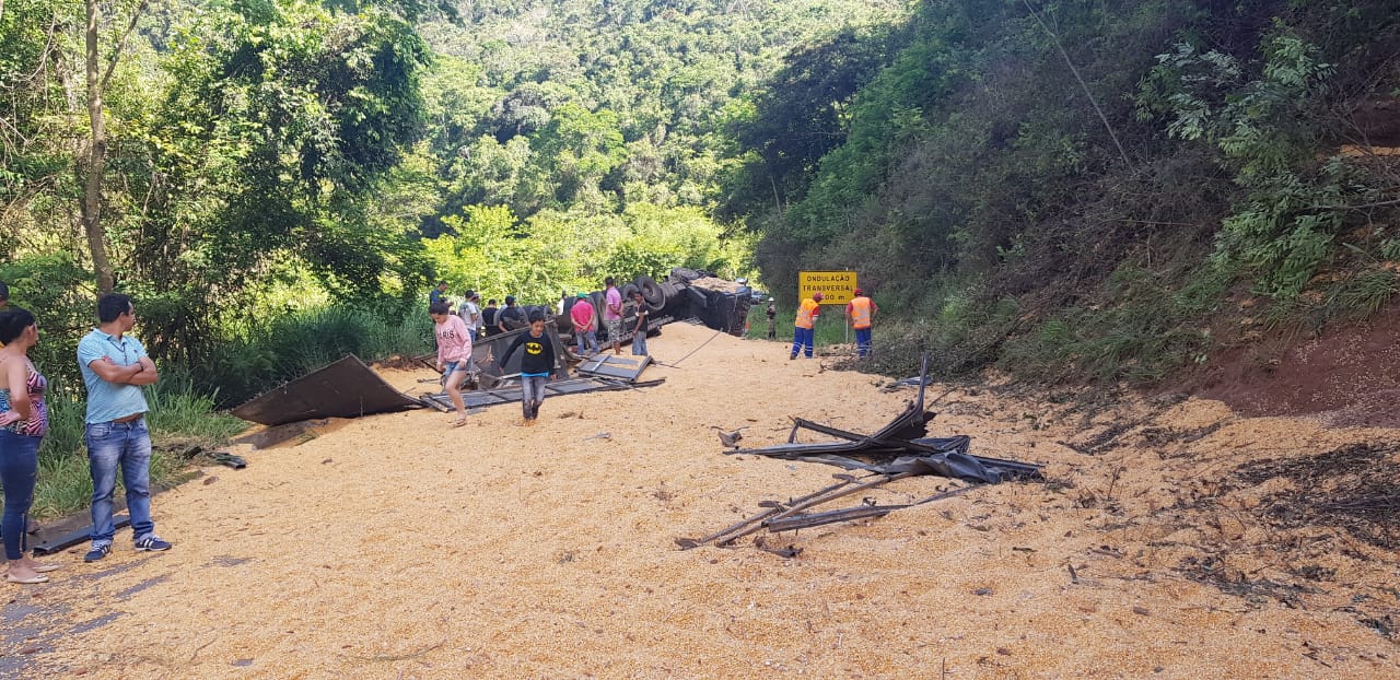 Ele disse à equipe da Policia Militar Rodoviária (PMRv) que percebeu que a carreta havia perdido os freios e, para evitar algo pior, jogou contra o barranco para que parasse, vindo a tombar na pista.