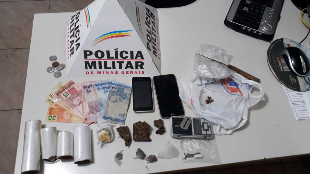 “Abordamos o carro no trevo da BR-262, saída para Reduto. Uma das ocupantes estava levando uma pedra de crack de tamanho considerável e quatro tabletes de maconha. Foi identificado o fornecedor no bairro Santa Terezinha. Encontramos com ele uma bucha de maconha e na casa mais três buchas, balança de precisão, material para embalar e fracionar as drogas”.