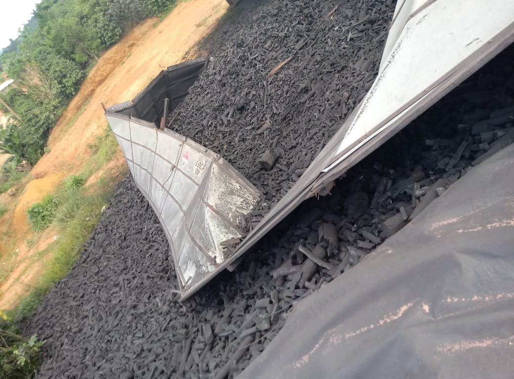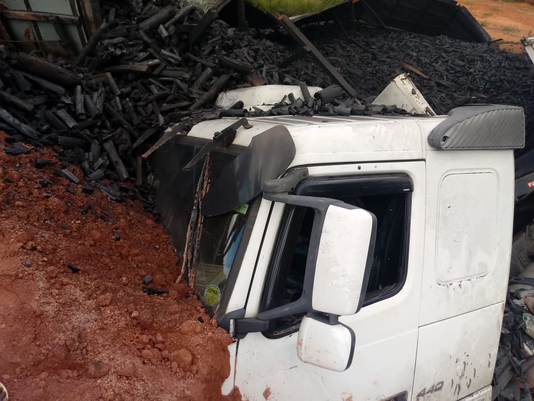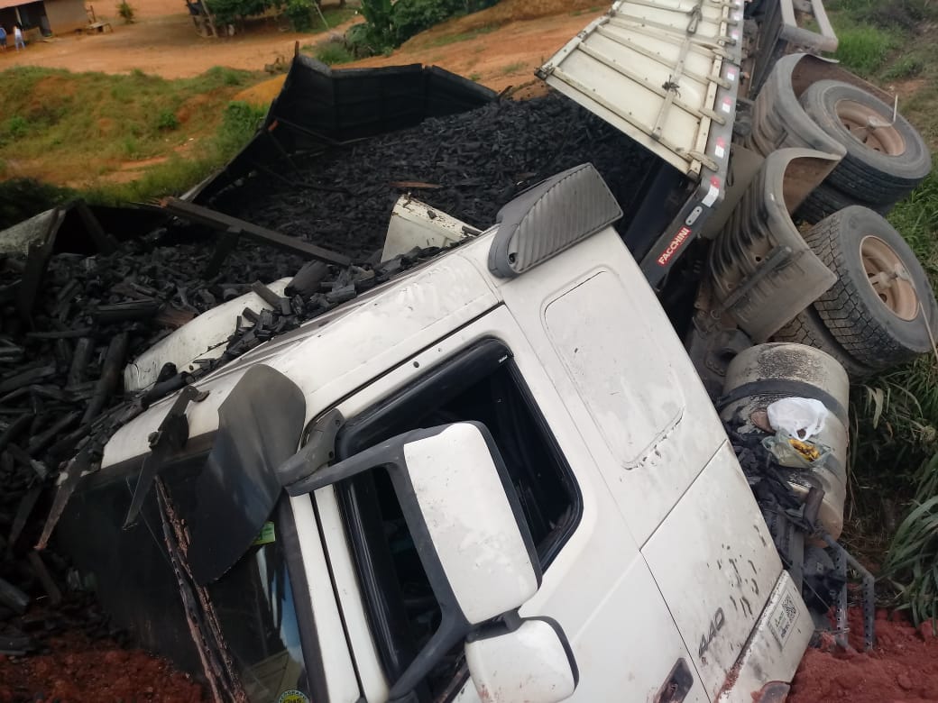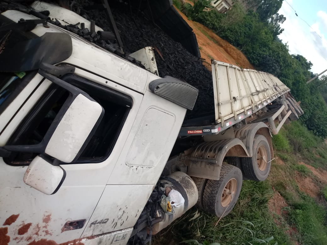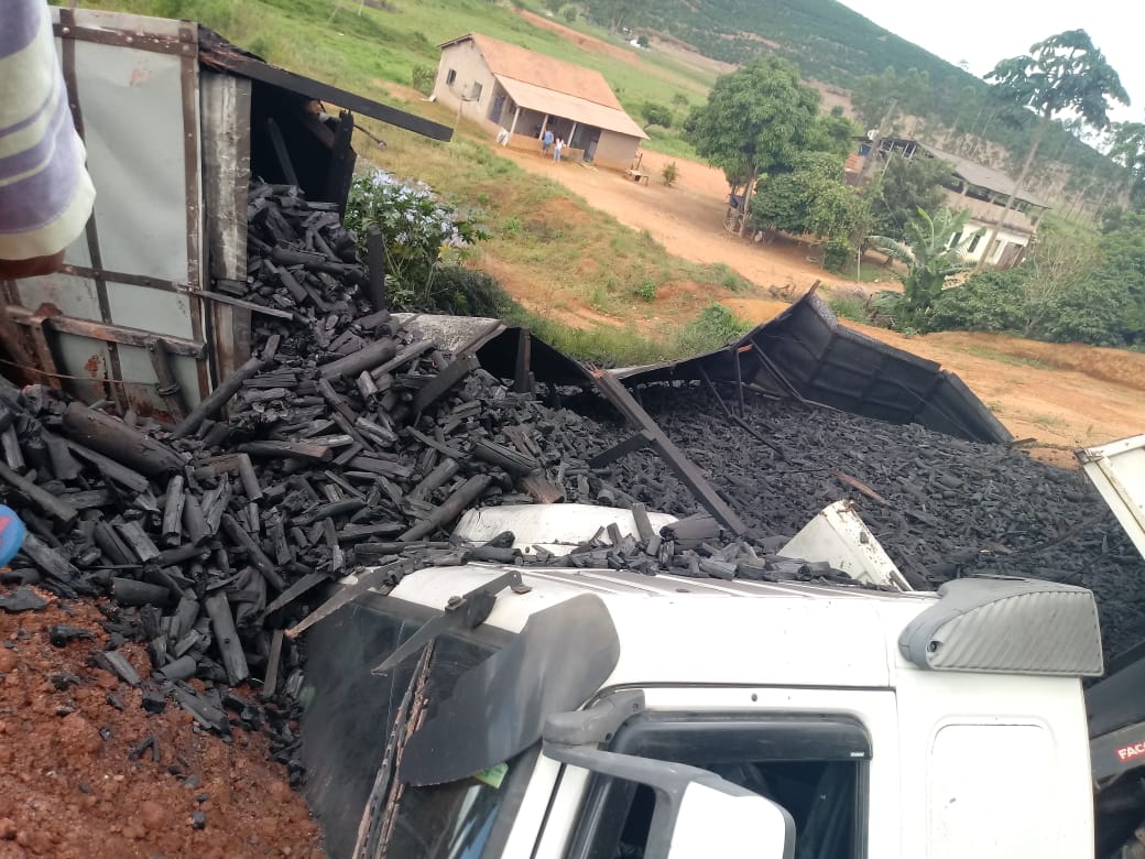 SÃO JOÃO DO MANHUAÇU (MG) - Uma carreta carregada com carvão tombou na BR-116, próximo ao trevo da cidade de São João do Manhuaçu, na manhã deste domingo, 16/12.
