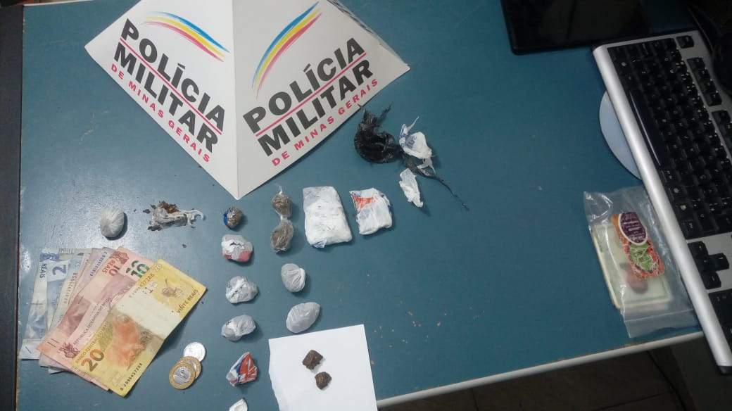 Foram apreendidos pela PM os seguintes matérias: 13(onze) buchas de maconha, 02 (dois) tabletes maiores de maconha, um papelote de cocaína e R$94,50 (noventa e quatro reais e cinquenta centavos).