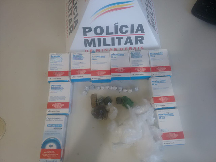 Na residência foram encontrados três tabletes de maconha, quinze buchas do mesmo entorpecente, um papelote de cocaína, diversas caixas de medicamentos (anabolizantes), várias sacolinhas utilizadas para a embalagem de drogas e três pássaros silvestres sem registro.