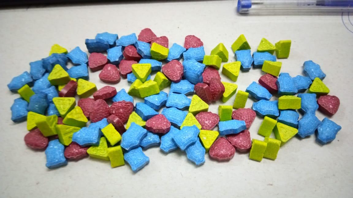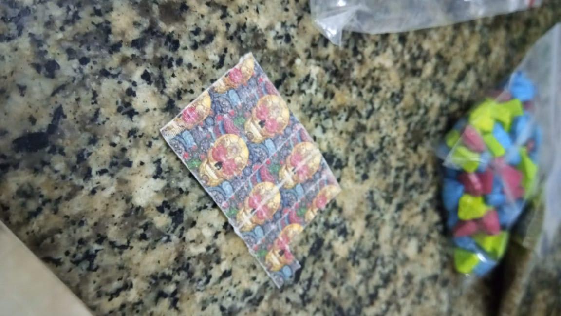 No carro, a PM encontrou 115 Balas Sintéticas (ecstasy), 25 Adesivos Sintéticos (LSD), uma porção de DrySift (drogas sintéticas), outra de MD (drogas sintéticas) e uma de maconha.