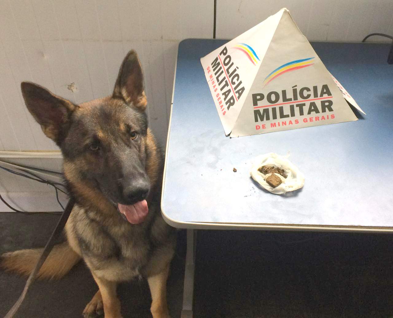 MANHUAÇU (MG) - O cão farejador Aquiles encontrou um tablete de maconha escondido numa fresta nas adjacências da escadaria Ana Fraga de Mendonça, no Bairro Santana, em Manhuaçu, durante operação da Polícia Militar, nesta quarta-feira, 13/02.