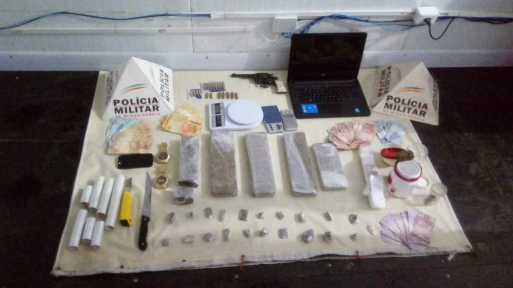 Com base em uma denúncia, equipe da PM foi até o local e fez buscas na residência. Além das barras e tabletes, foram apreendidos ainda dois potes e um caneca com porções de maconha, um papelote e um pote contendo cocaína, um revólver e 20 munições, notebook, dois relógios de pulso, celular, faca, estilete, materiais para embalo de drogas, R$ 2.975,00 e três balanças de precisão.
