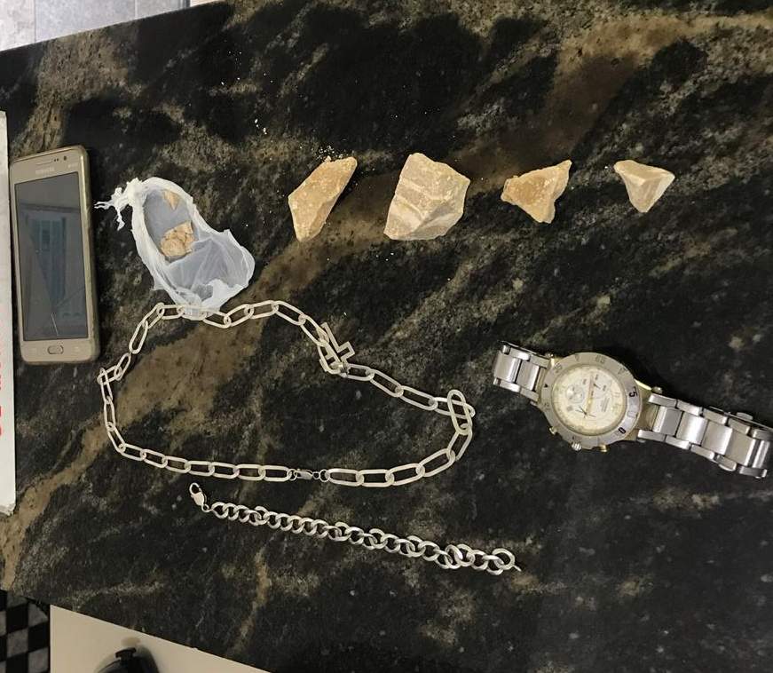Durante buscas no menor, ao pedirem para descer a bermuda e abaixar, caiu de seu ânus uma sacola com quatro pedras grandes de crack e outros pedaços pequenos. Com os dois maiores nada foi encontrado.