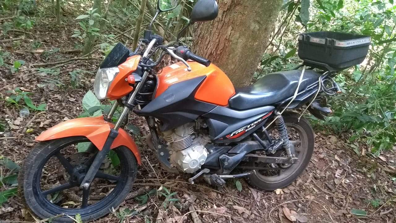 Equipes policiais realizaram rastreamento durante o domingo e, após receber denúncias, a motocicleta foi localizada, escondida em uma mata na região do bairro Matinha.