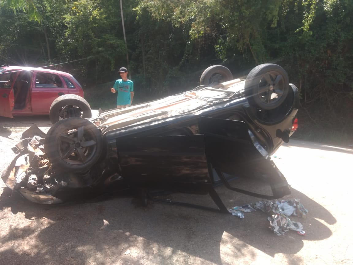 O motorista perdeu o controle da direção numa curva e capotou. O carro parou com as rodas para o alto em cima da pista.