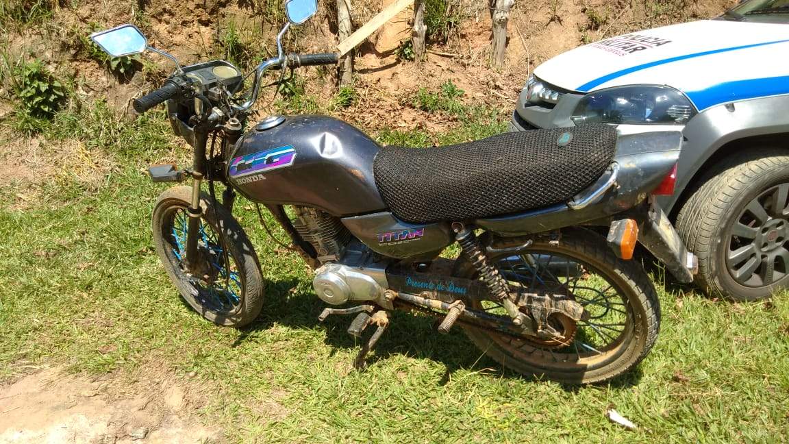 Militares localizaram o veículo sem placa de identificação, porém através da consulta do chassi verificou se tratar de motocicleta que havia sido furtada no dia 12/03 em São João do Manhuaçu.