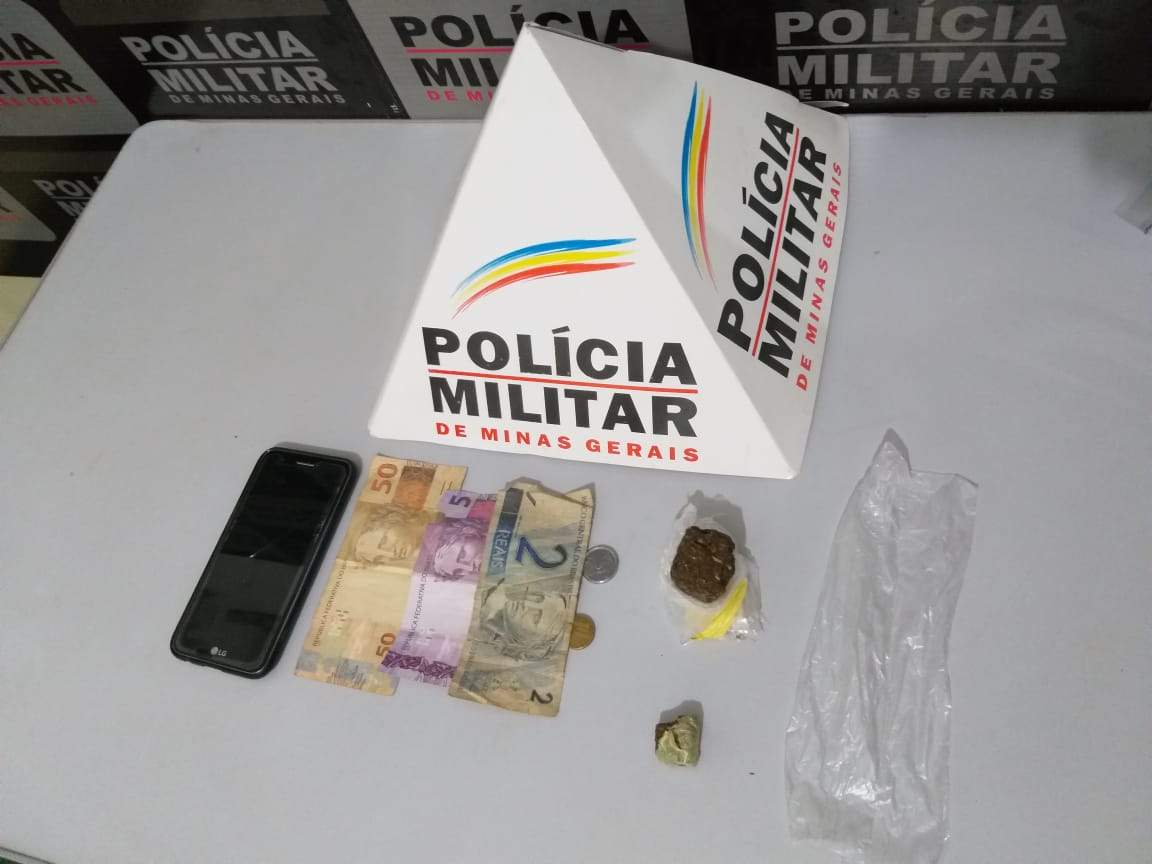 Durante vistoria na casa foram encontrados um tablete de maconha, uma bucha de maconha, sacolinhas de chup-chup para dolagem da droga, celular e uma quantia de R$57,00.