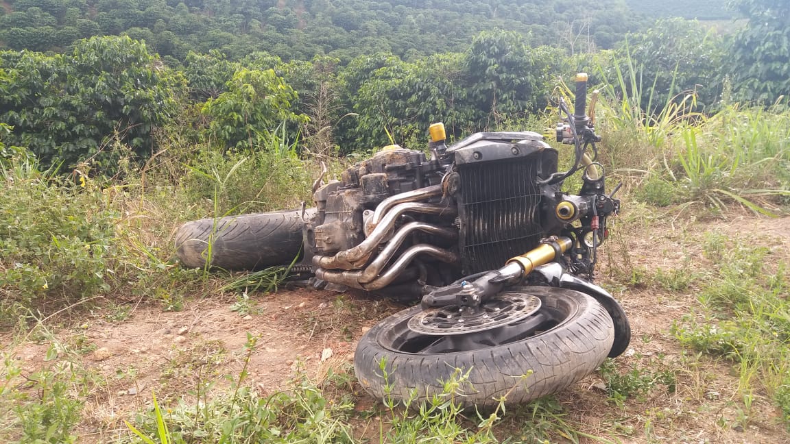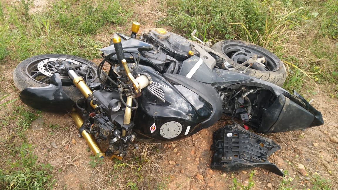 A moto apresentava vários danos e faltando algumas peças, como descarga, painel e conjunto do farol. Não foi possível identificar quem estava com a motocicleta.