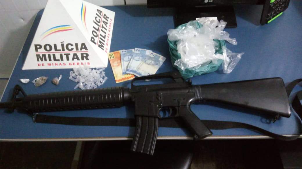 Foram apreendidas três buchas de maconha, uma réplica de fuzil M4 (de ar comprimido), diversas sacolas (tipo chup-chup), 40 pinos de plástico vazios e 26 reais.