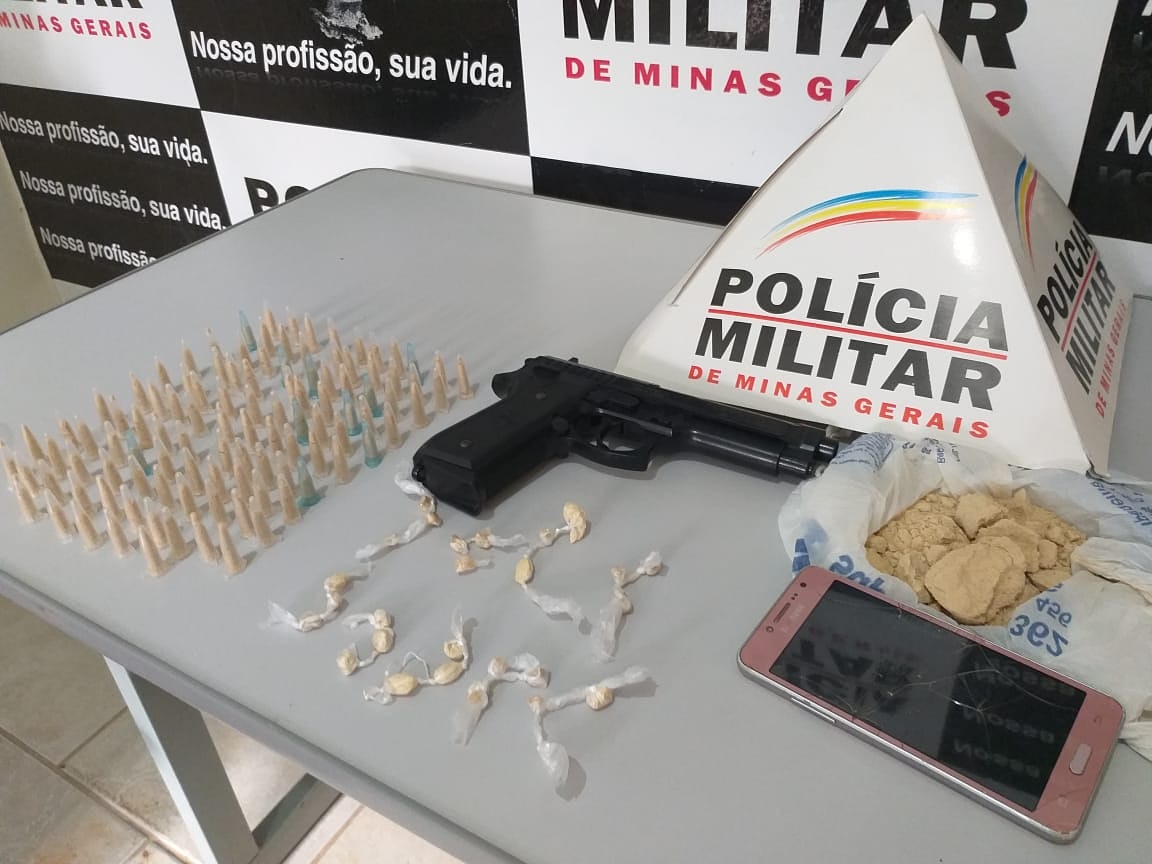 Após a PM receber informações de suspeita de tráfico de drogas, foi montada uma operação. Na casa do suspeito foram encontrados, 105 pinos de cocaína, 28 pedras de crack e uma sacola contendo grande quantidade de cocaína, além de réplica de arma de fogo. Três aparelhos celulares foram recolhidos.