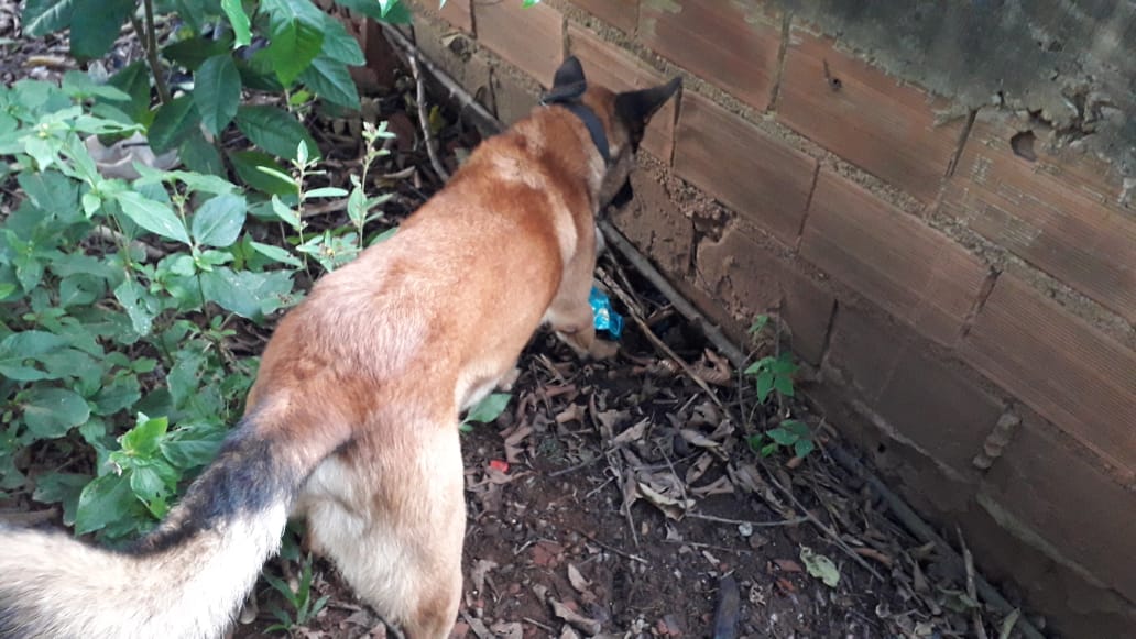 Com apoio da equipe da ROCCA (Rondas ostensivas com cães) e a aplicação do cão farejador Titan foi encontrado um tablete de maconha enterrado no quintal da casa do autor de 46 anos.