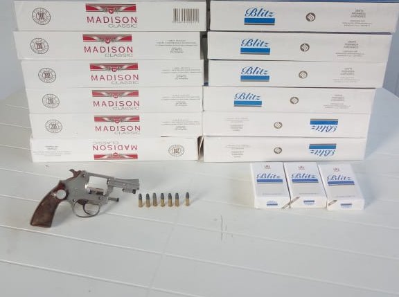 Foram recolhidos um revólver calibre 22, sete cartuchos do mesmo calibre, 43 pacotes de cigarros e três maços de cigarros.