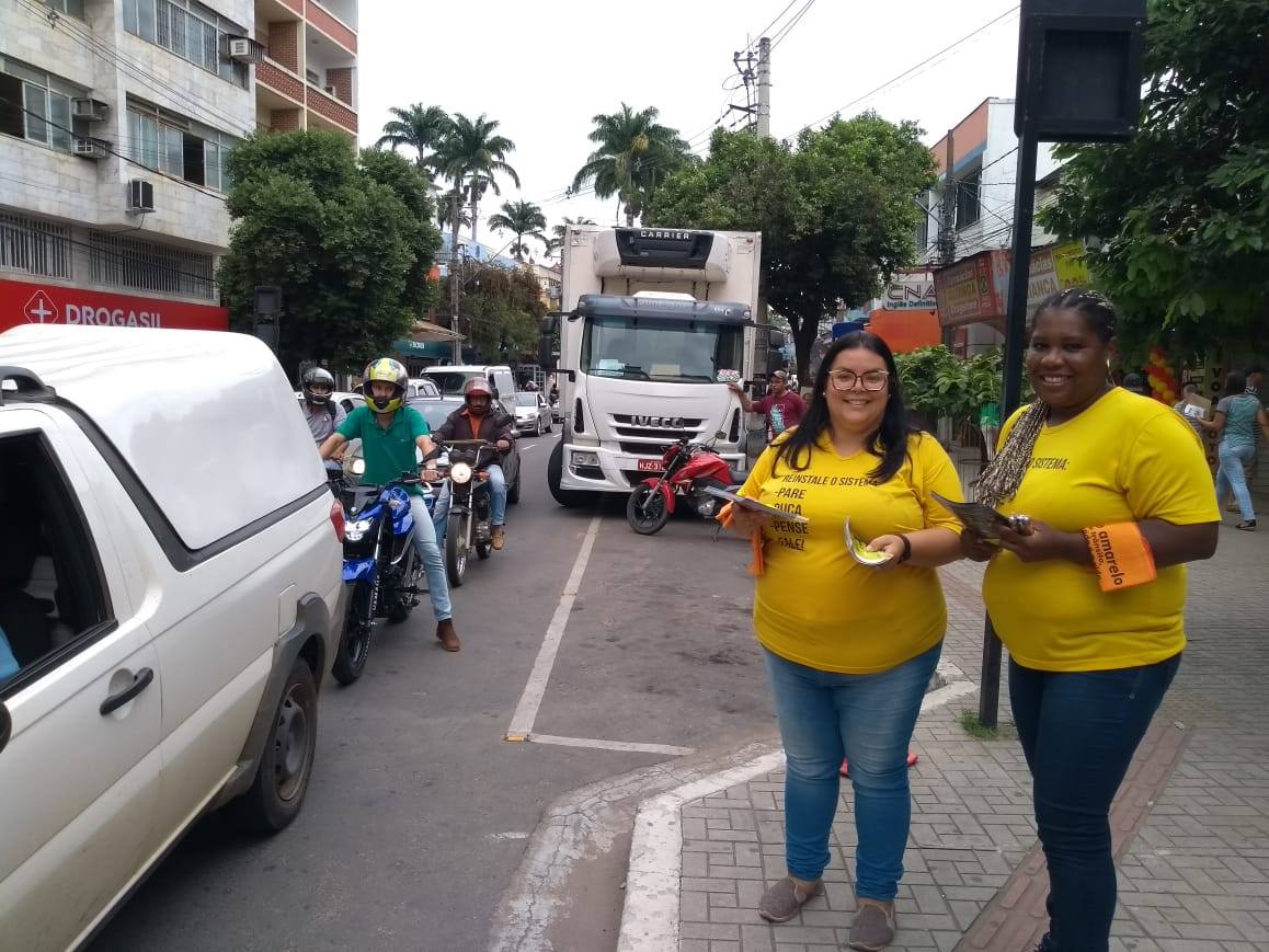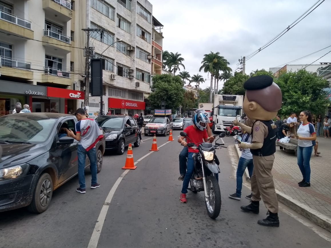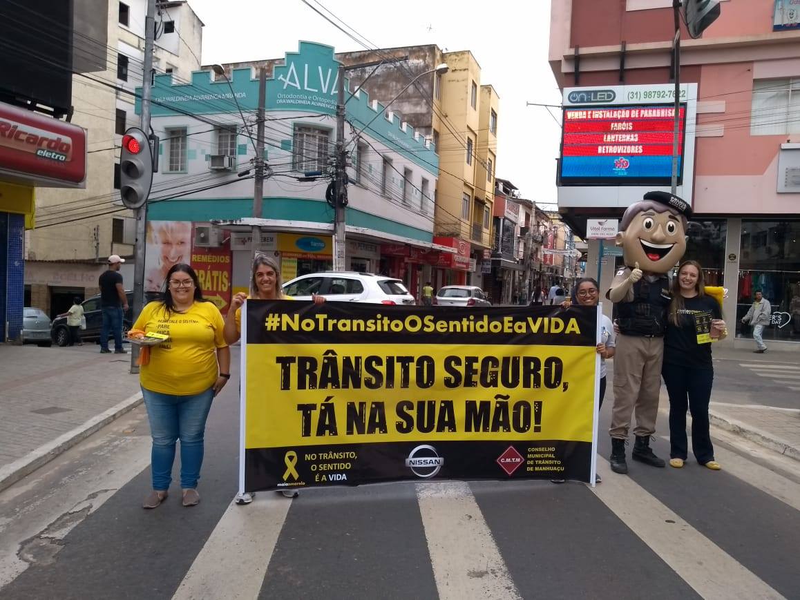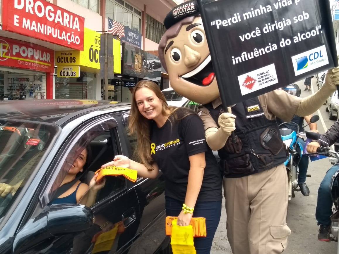 MANHUAÇU (MG) - Motoristas e motociclistas que passaram pelo centro de Manhuaçu nesta segunda-feira, 06, foram abordados por alunos da Escola Estadual Salime Nacif, Polícia Militar, agentes de saúde das unidades do Programa de Saúde da Família dos Bairros Santo Antônio e São Vicente, além da coordenação da campanha Maio Amarelo.