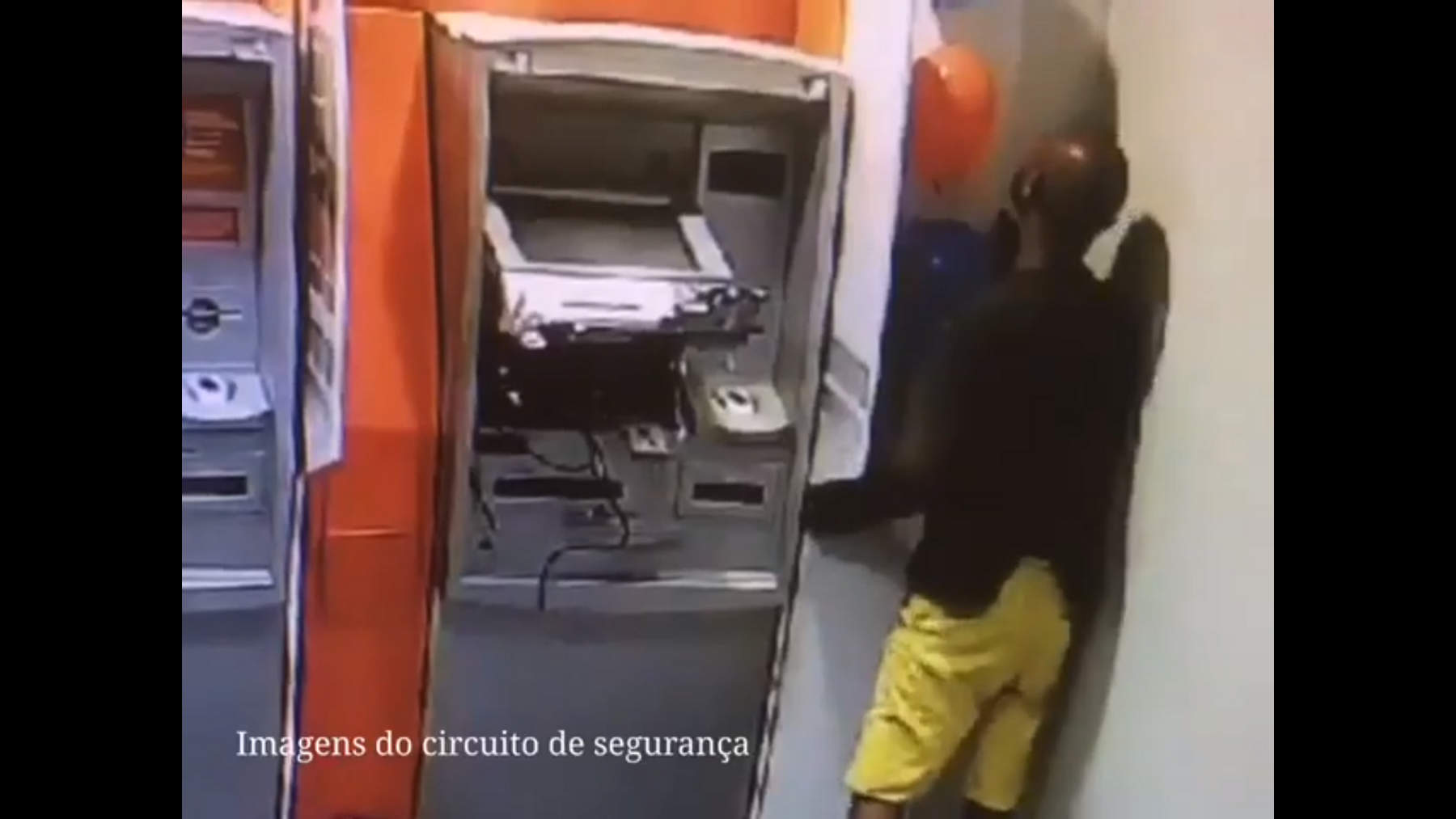 Através das imagens de videomonitoramento, é visualizado o momento em que o jovem arromba parte do caixa eletrônico. A central acionou o sistema de segurança e o autor fugiu.