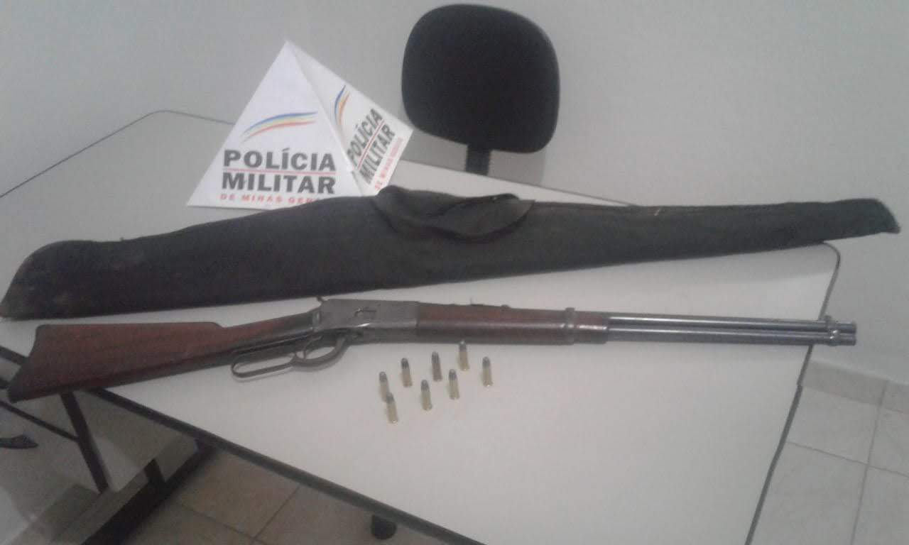 Ao ser realizada a abordagem ao condutor de 55 anos, os militares localizaram no interior do veículo uma carabina, marca Rossi, modelo Puma, municiada com 08 munições intactas Cal .38.