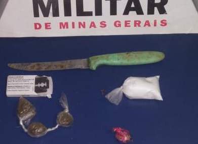 O rapaz estava com quatro buchas de maconha, uma porção de cocaína, uma faca, lâminas de barbear e sacolas para embalar drogas.