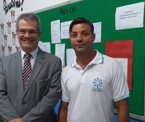 O presidente do Conselho, Claudinei Henrique Ramos, ao lado do Juiz da Comarca de Divino, Dr. Maurilio Cardoso Naves, e os policiais militares do destacamento de Orizânia na implantação do novo sistema.