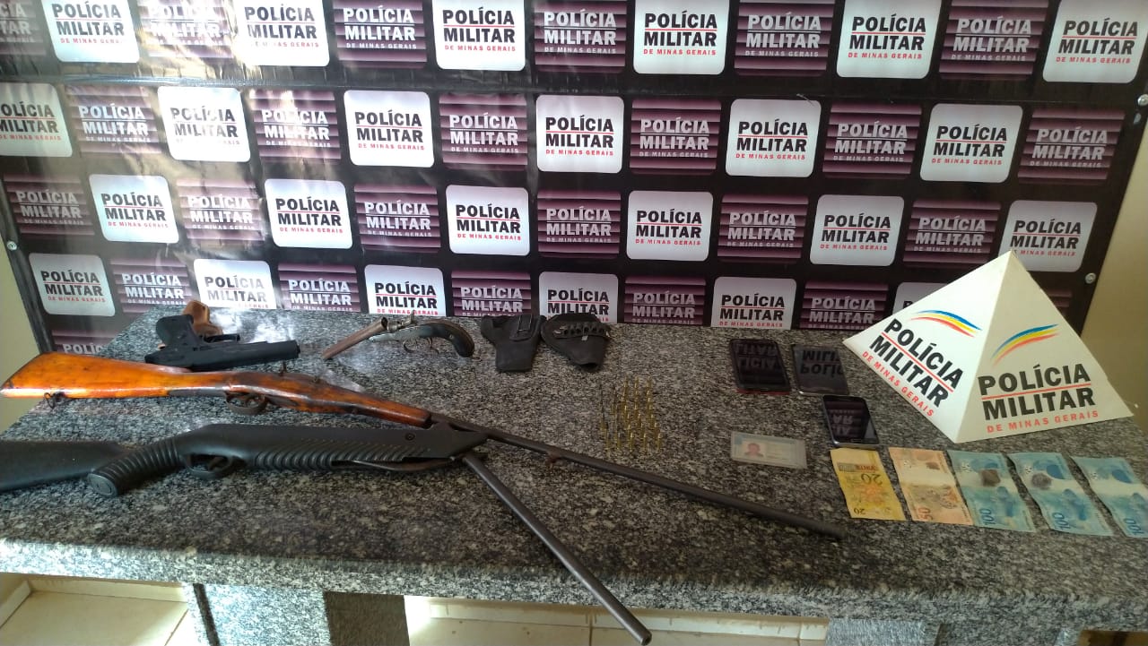 Foram recolhidas três espingardas calibre 22, uma garrucha calibre 38 e uma réplica de pistola semiautomática. 38 munições e 370 reais foram apreendidos, além de duas buchas de maconha e três veículos.