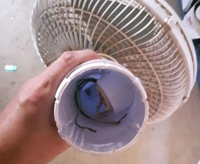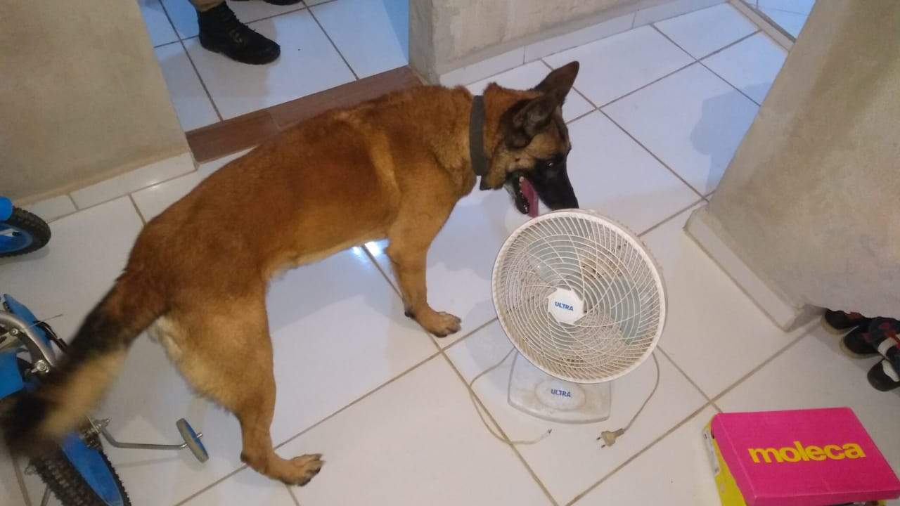 Ao aplicar o cão de faro Titan, os policiais conseguiram localizar três pedras brutas de crack. A droga estava escondida dentro de um ventilador de mesa.