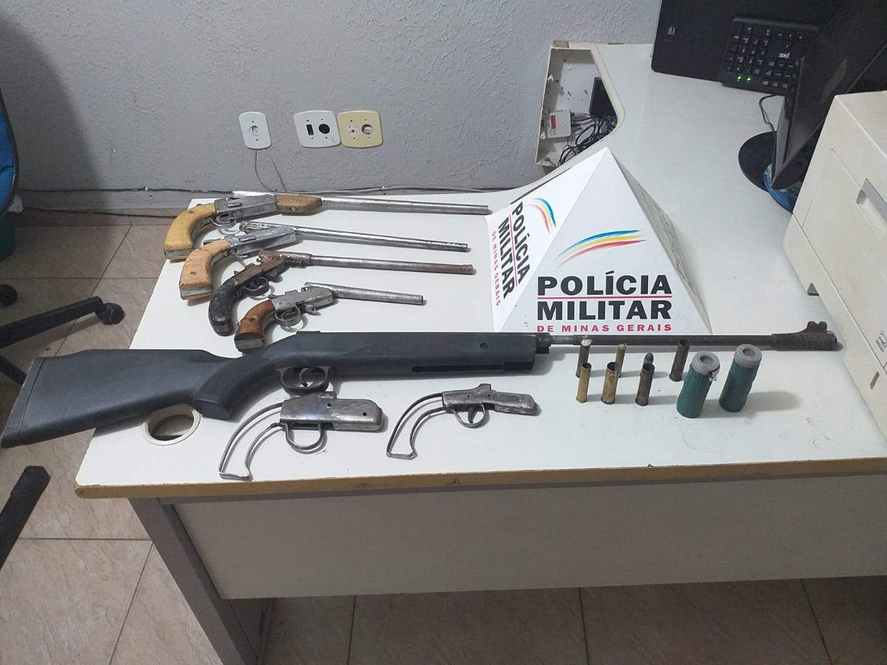 Os militares deslocaram-se ao local e chegando lá, em contato com o denunciado os militares realizaram buscas no imóvel e localizaram quatro armas tipo garruchão, uma espingarda calibre 22, diversos cartuchos, diversos canos e cabos de madeira e duas estruturas de armas de fogo.