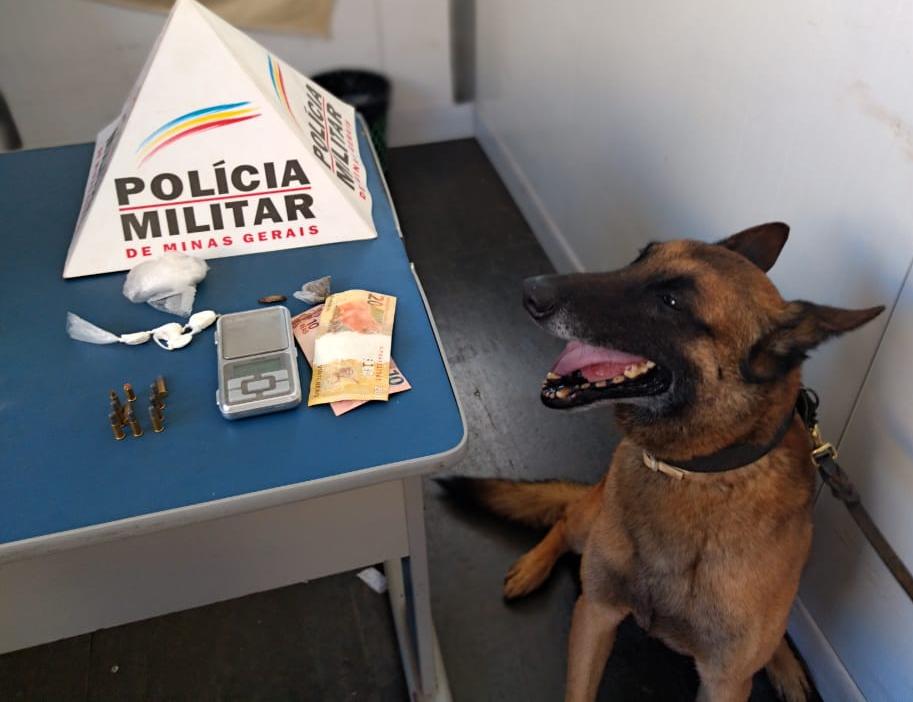 Os militares foram até o endereço e fizeram buscas no imóvel. O foragido não foi localizado, mas a PM, com apoio dos cães de faro Titan e Fany, encontraram material para embalar drogas, balança de precisão e munições. Uma certa quantidade de entorpecentes também foi apreendida.