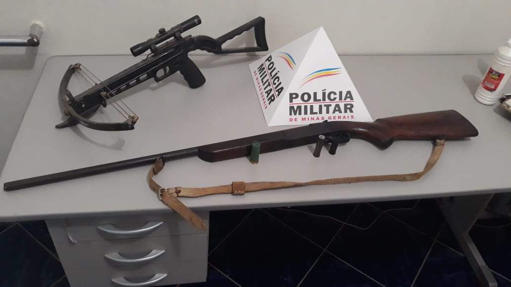 Em um dos locais foi apreendida uma besta com luneta e uma munição calibre 12, em outro foi localizada uma espingarda calibre 28, uma munição intacta e outra deflagrada do mesmo calibre.