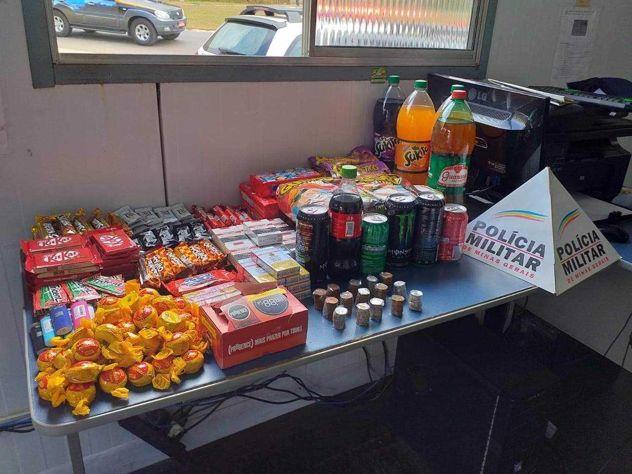 No local foram encontradas 04 garrafas de refrigerantes, 02 latas de refrigerantes, 03 latas de energético,14 pacotes de salgadinhos, 10 pacotes de preservativo, 15 maços de cigarro, 07 maços de cigarro Paiol, 18 pacotes de biscoito waffle, 21 pacotes de chicletes, 11 isqueiros, 117 chocolates diversos, 03 pacotes de balas, 12 pacotes de biscoito recheado, R$16,80 e 80 gramas de cocaína.