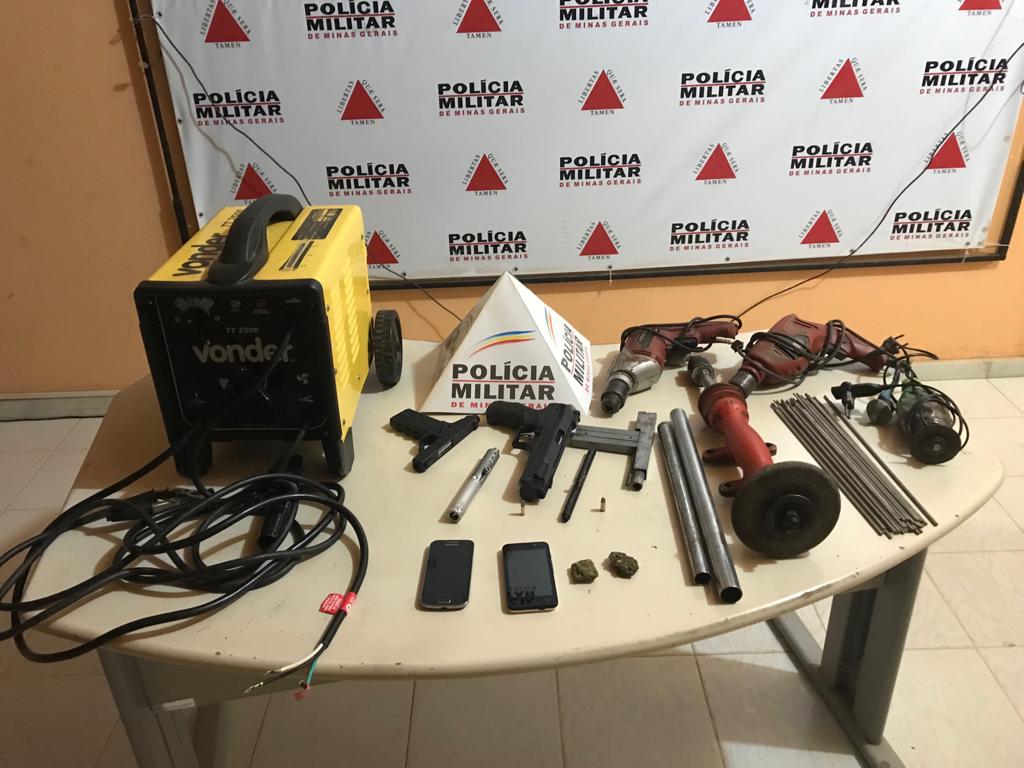 Havia duas munições, dois celulares, duas porções de maconha, mandril com esmeril, máquina de solda e furadeiras.