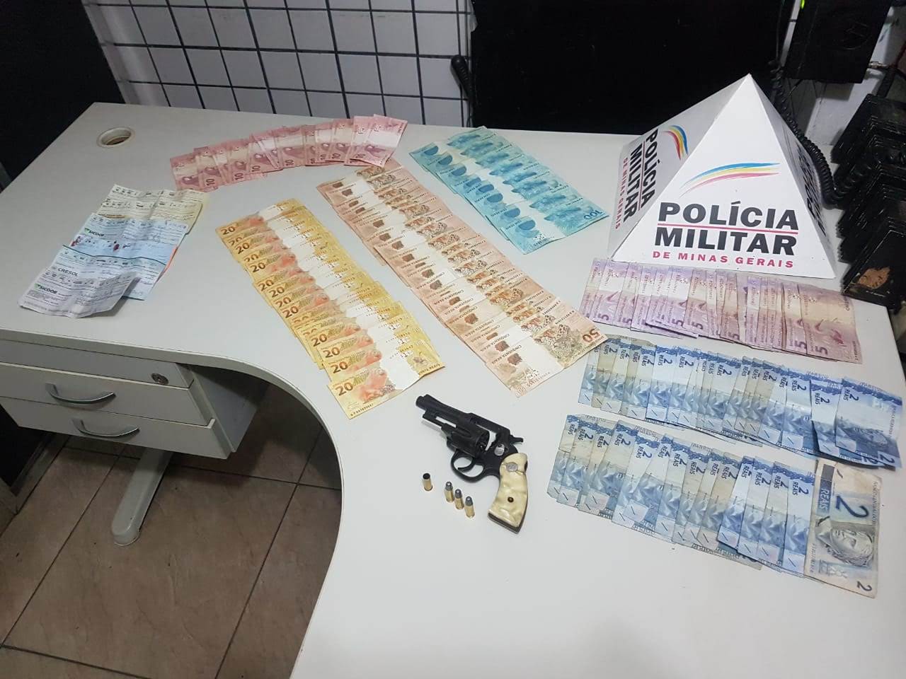 No carro, a PM recuperou 2.526 reais e seis folhas de cheques e apreendeu um revólver calibre 32 com três munições picotadas e uma deflagrada.