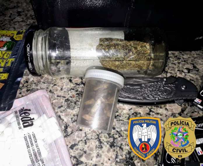 Em Pedra Menina, Distrito de Dores do Rio Preto na residência de um homem de 25 anos, na busca em uma “tulha” e na sua residência os policiais encontraram um rolo filme pvc e sacolas, comum para embalar pequenas quantidades de droga, 7 pinos de cocaína, 2 socos ingleses e 612 reais.