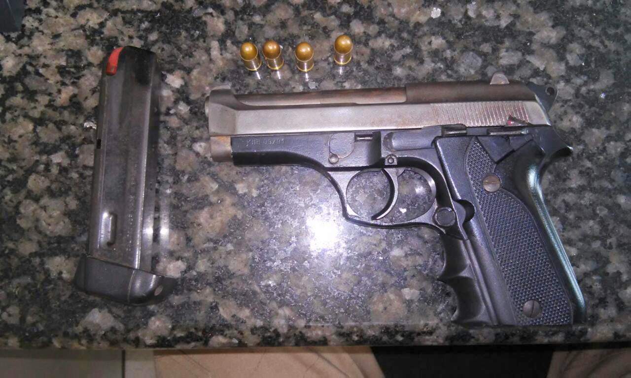 A PM segue em rastreamento para localizar o autor. A arma de fogo, uma pistola calibre 380 e quatro munições intactas, foram apreendidas.