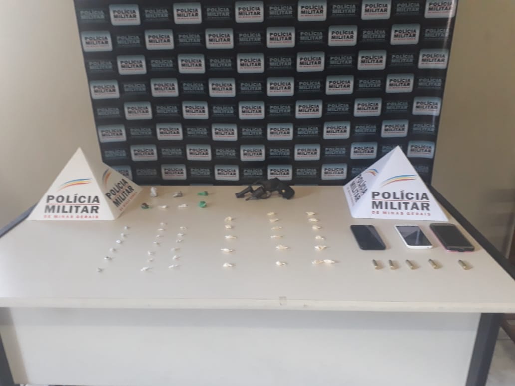 A PM apreendeu 20 pedras de crack, 22 papelotes de cocaína, três buchas de maconha, um revólver, sete celulares, seis munições, um carro e 1.378 reais em dinheiro.