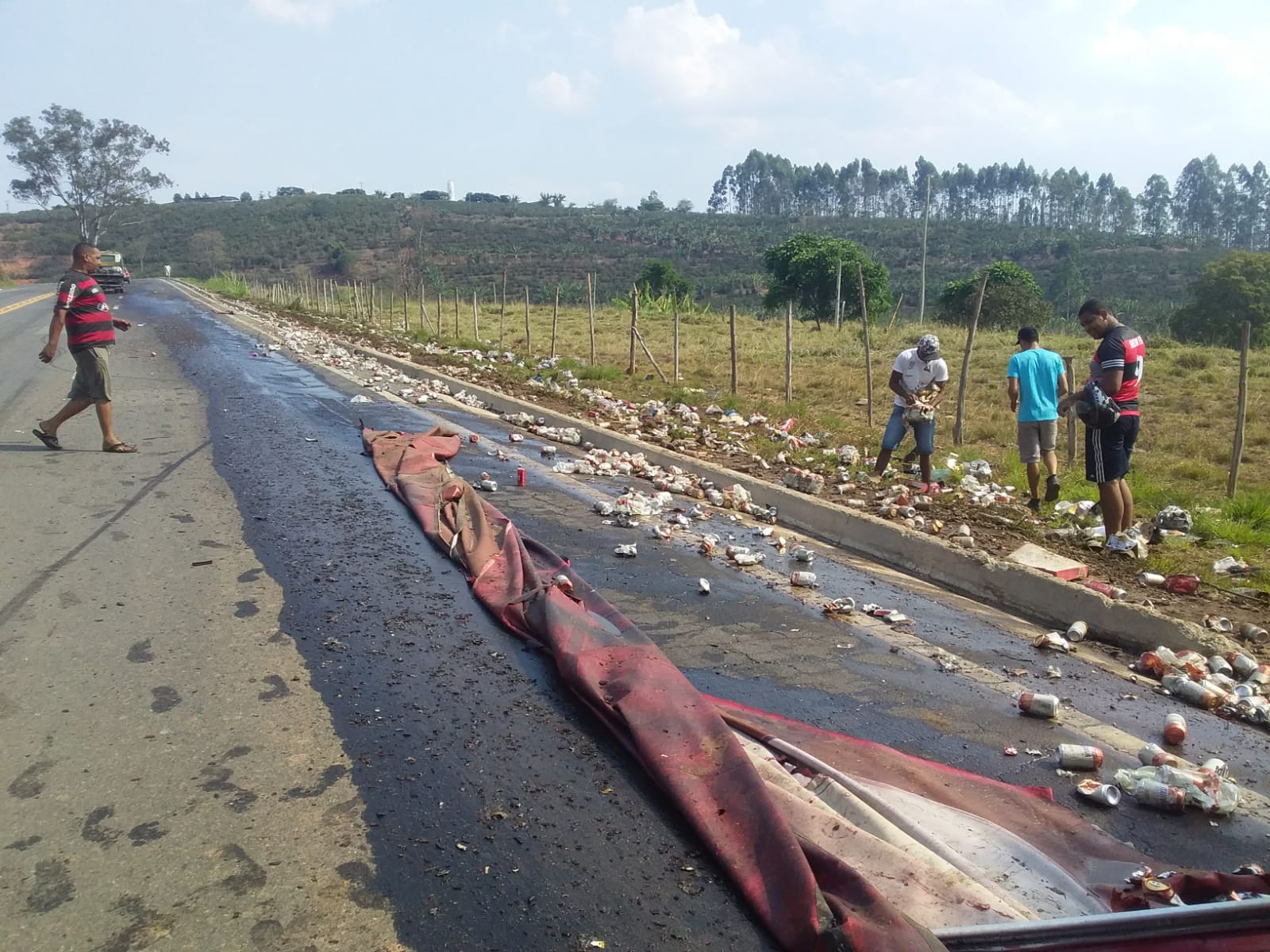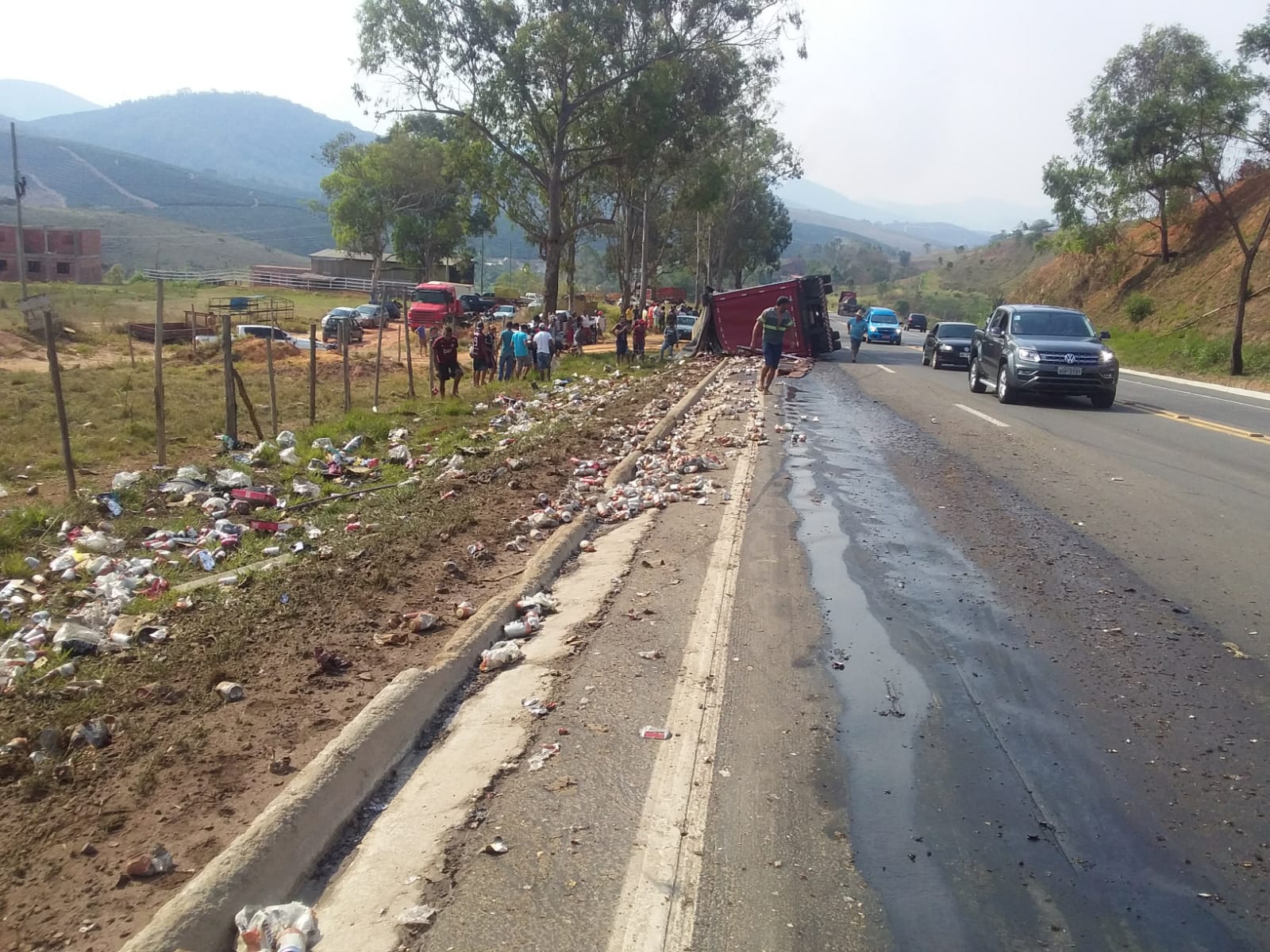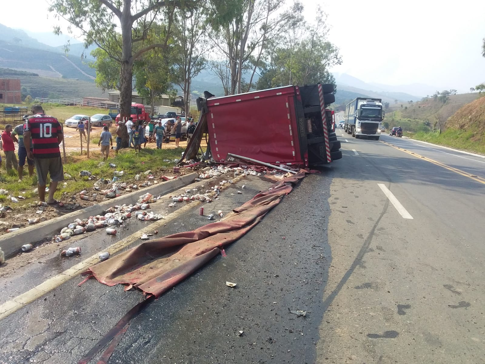 SÃO PEDRO DO AVAÍ / MANHUAÇU (MG) - Uma carreta carregada com cervejas tombou no km 584 da BR-116, na região de São Pedro do Avaí, distrito de Manhuaçu, na tarde de sábado, 19/10.