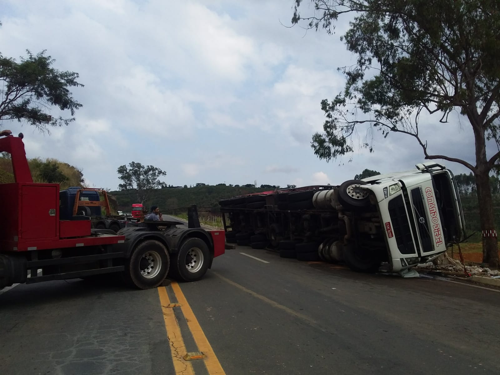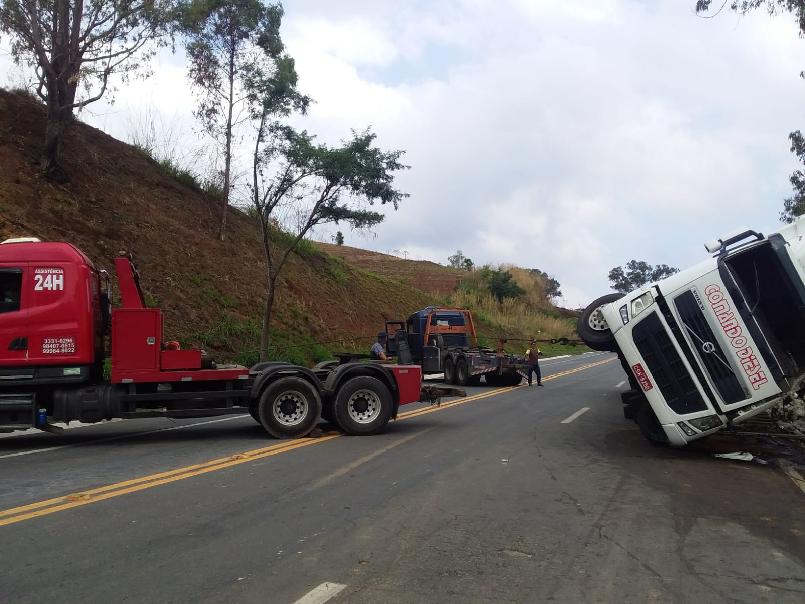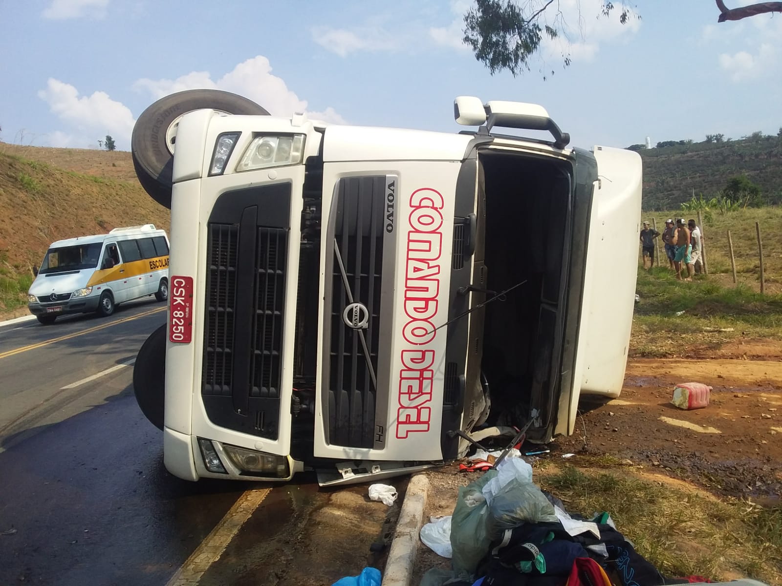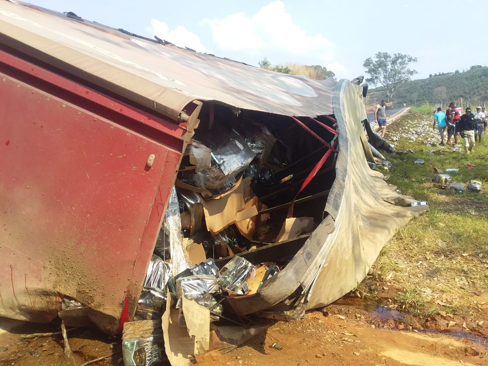 SÃO PEDRO DO AVAÍ / MANHUAÇU (MG) - Uma carreta carregada com cervejas tombou no km 584 da BR-116, na região de São Pedro do Avaí, distrito de Manhuaçu, na tarde de sábado, 19/10.