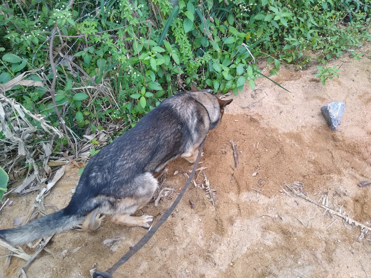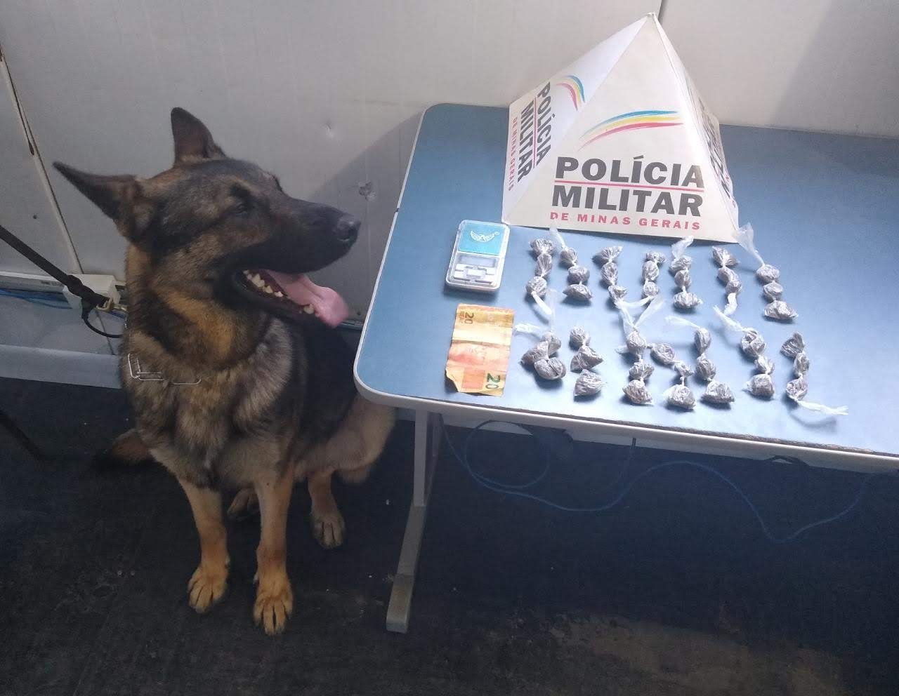A equipe de rondas com cães foi acionada e aplicou o cão farejador Aquiles que indicou a localização de mais 39 buchas de maconha. Elas estavam no entorno da quadra poliesportiva.