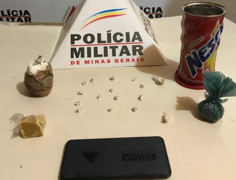 Apesar da forte chuva, a equipe PM deu prosseguimento as buscas. No tal caminho, em meio à vegetação, policiais encontraram um aparelho celular e, num pote de achocolatado, 80 gramas de cocaína, 14 pedras pequenas de crack prontas para a venda e outras pedras de crack pequenas; além de maconha.