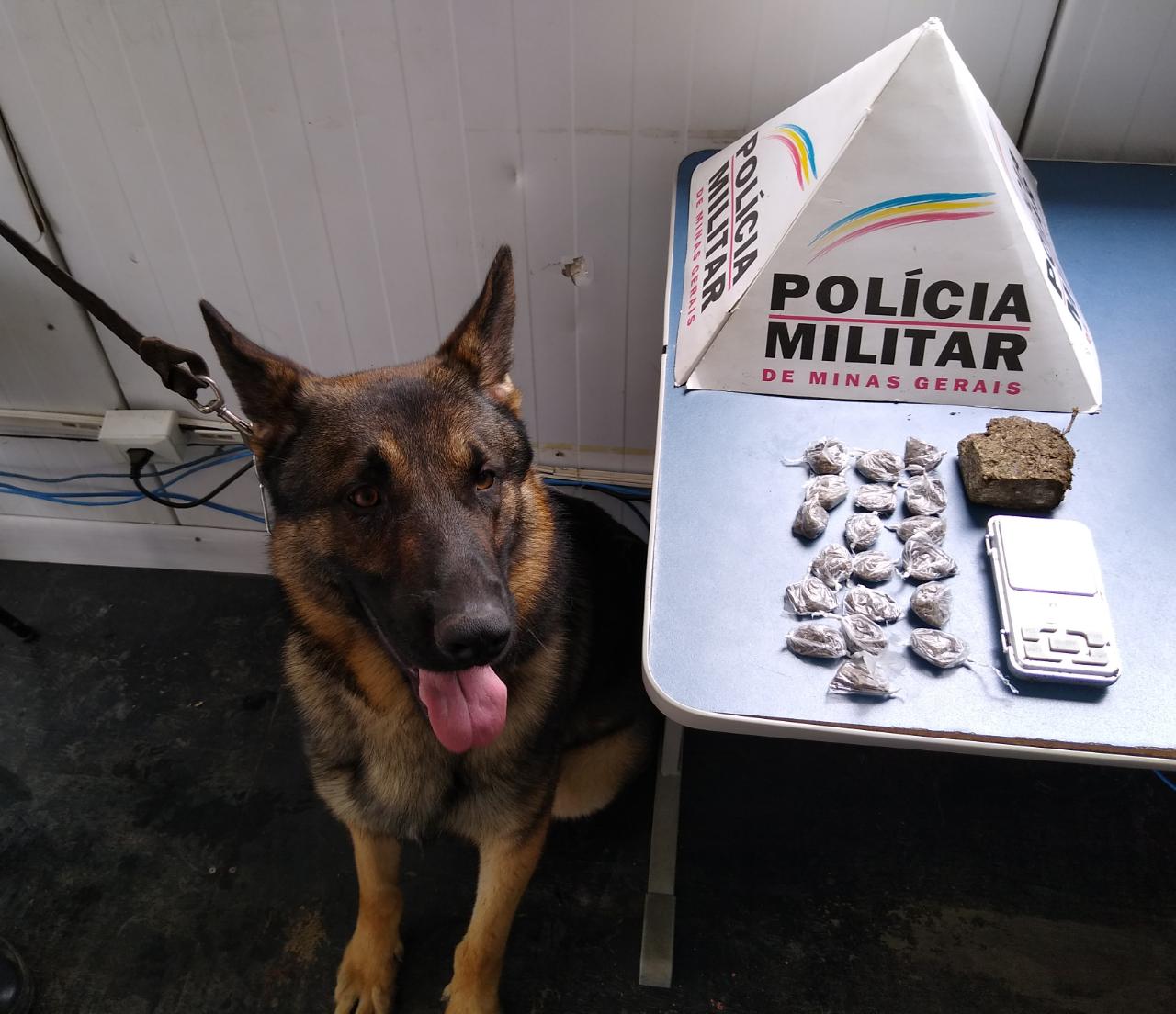 Foi aplicado o cão farejador Aquiles e o animal localizou dezenove buchas de maconha escondidas debaixo de entulho, na Rua Simão Francisco Romão.