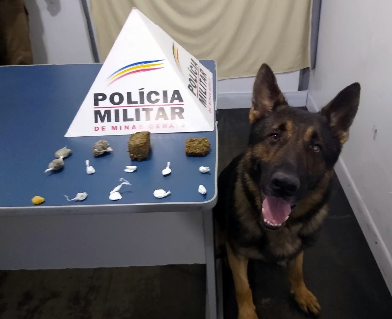 Por volta das 20h30min, a equipe policial realizou diversas abordagens e, com a ajuda do cão Aquiles, na rua Jacarandá, escondido na estrutura metálica do telhado de um bar, localizaram 03 buchas e 02 tabletes de maconha, 01 pedra bruta de crack e 08 papelotes de cocaína.