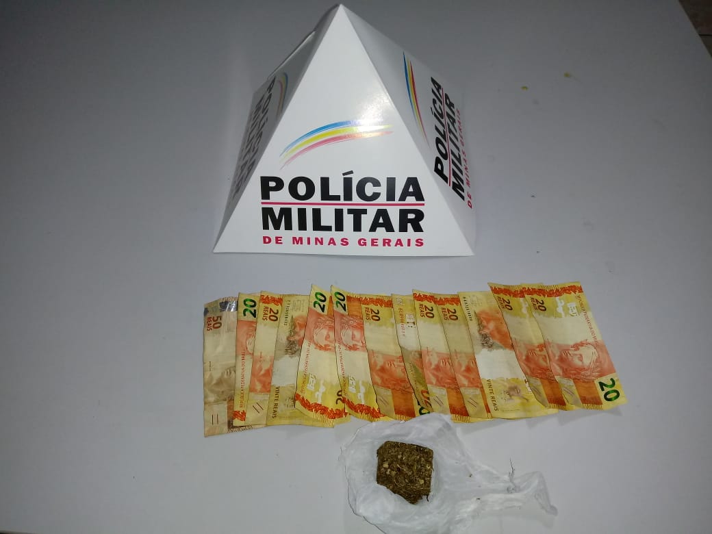 Durante buscas foi encontrado um tablete de maconha. Com o autor, foi apreendido ainda R$290,00.