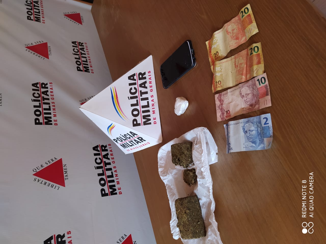 Foi montada uma operação de cerco e bloqueio e o veículo abordado no Córrego Areado. Foram localizadas duas barras e uma porção de maconha, um embrulho contendo cocaína e R$ 52,00.