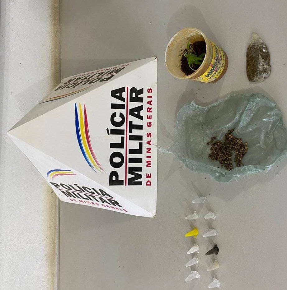 Foram realizadas buscas no local, sendo localizados 11 pinos de cocaína vazios, um embrulho com sementes de maconha e uma porção de maconha, além de diversas mensagens no celular do autor negociando as drogas para venda.