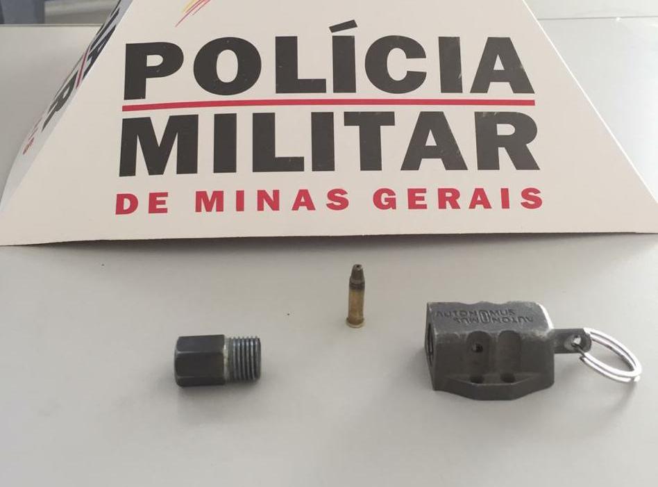O indivíduo foi abordado, momento em que retirou as mãos dos bolsos segurando com uma das mãos um objeto que parecia ser um chaveiro, porém ao verificarem tal objeto, os militares constataram que se tratava de uma arma de fogo dissimulada carregada com um cartucho calibre 22.