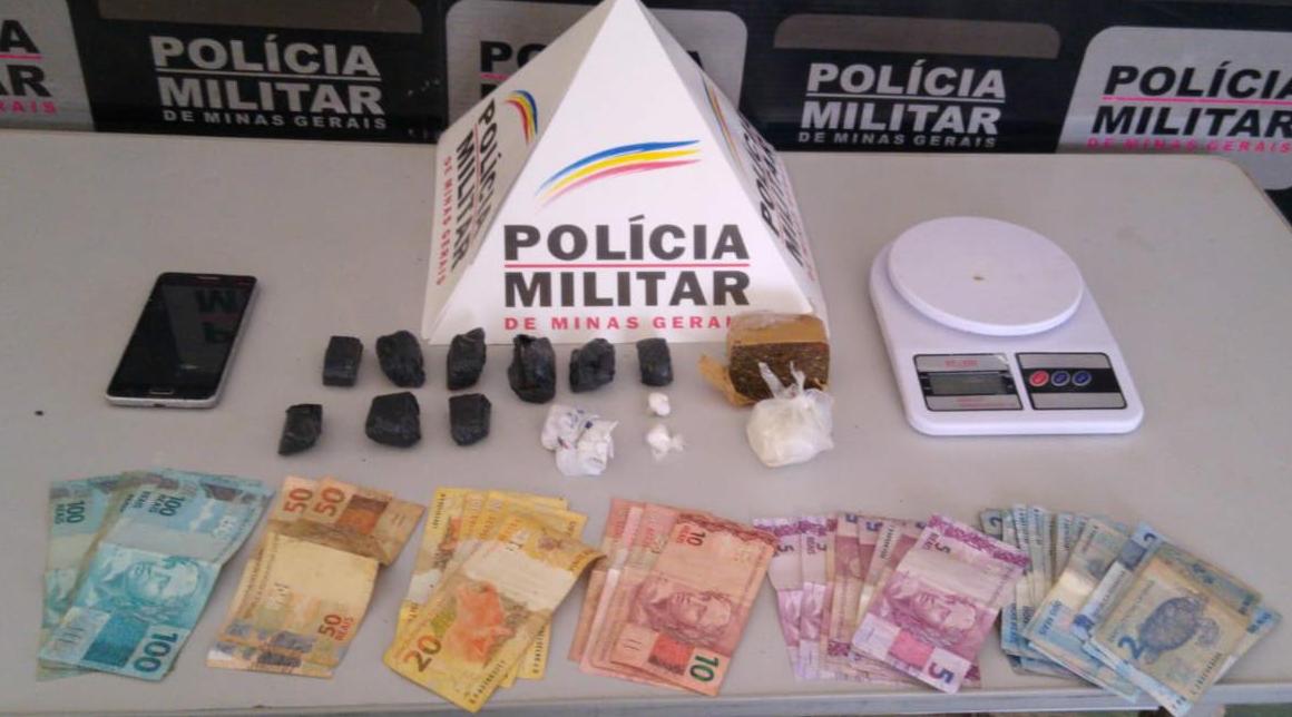 Foram localizadas 01 barra e 09 tabletes de maconha, 04 porções de cocaína, 01 balança de precisão e R$ 818,00.