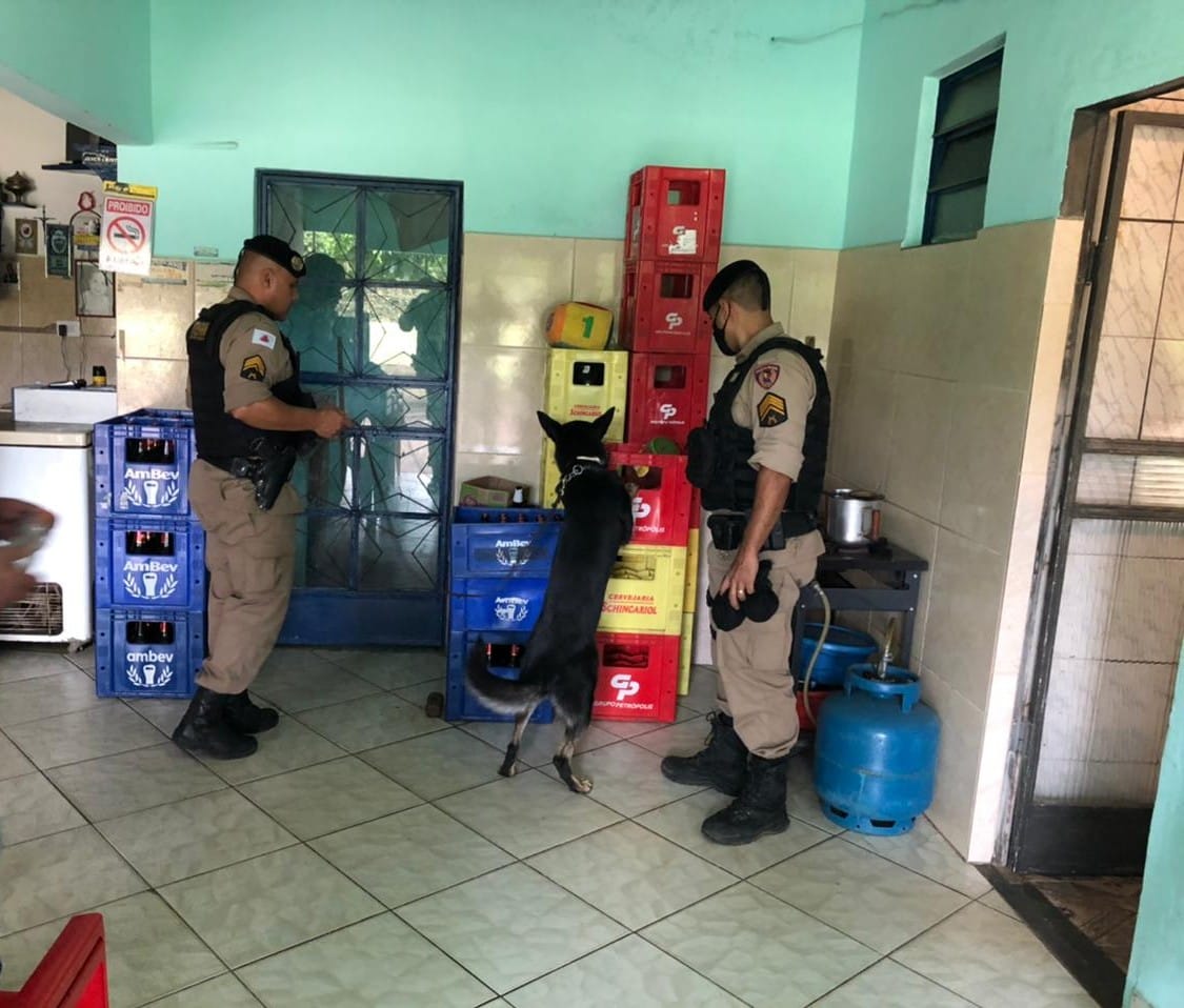 Foi aplicada a cadela farejadora Kacau. Ela indicou a localização dos entorpecentes. Dez buchas, uma barra e uma porção de maconha e seis papelotes de cocaína estavam escondidos enterrados em pontos diversos.