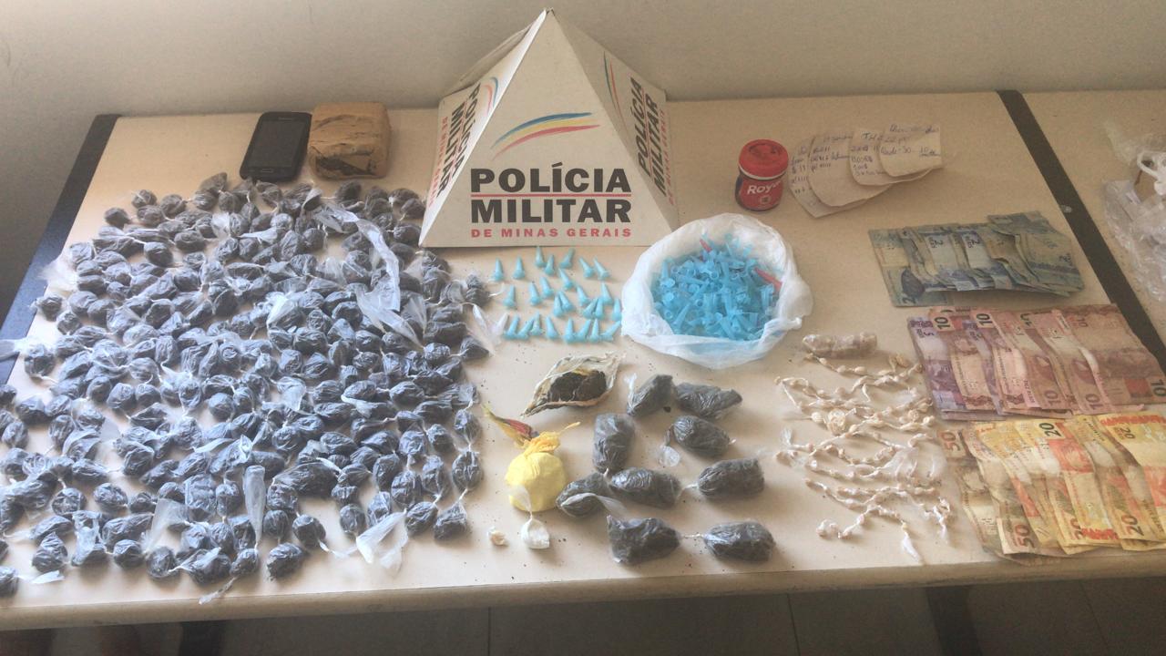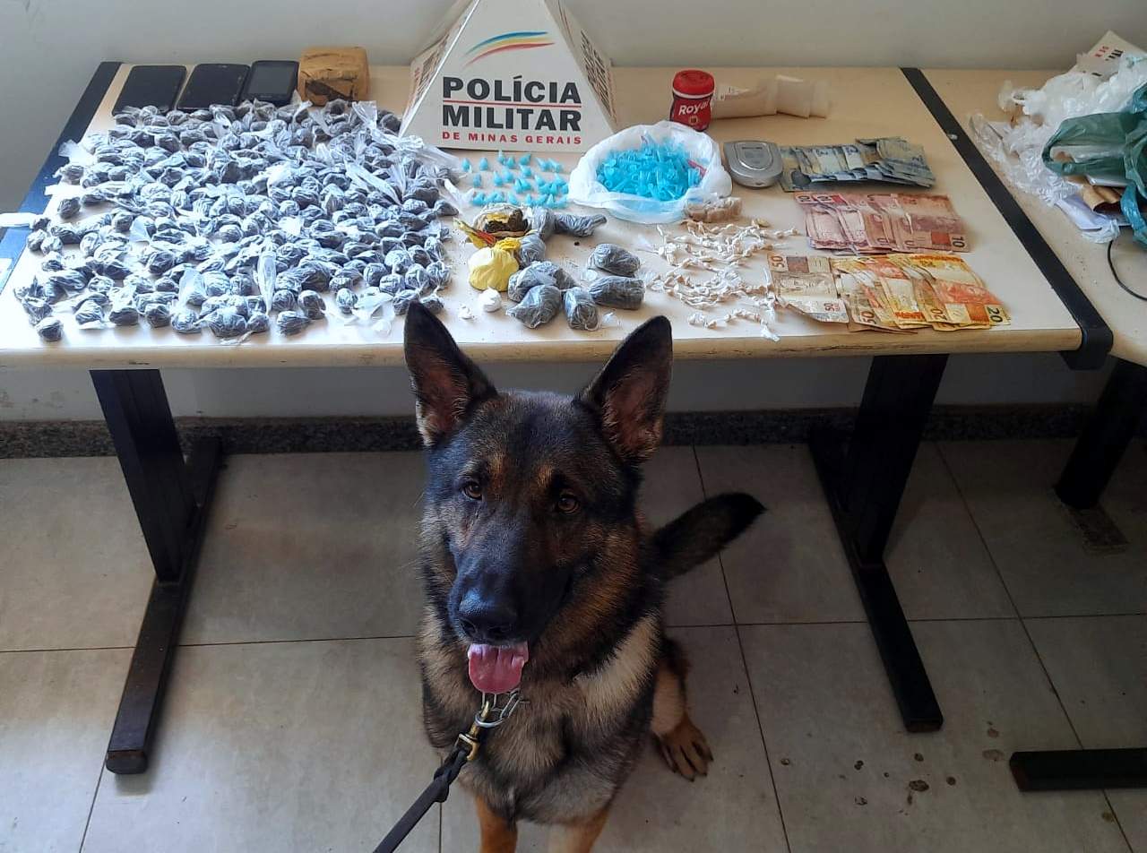 As drogas foram localizadas após aplicação do cão de faro Aquiles. No total, a PM recolheu 237 buchas, meia barra e 10 porções de maconha, 101 pedras comerciais e 03 pedras brutas de crack, 03 porções e 32 pinos de cocaína, além de R$538,00 em dinheiro, 01 balança digital e embalagens para preparar a droga para comercialização.