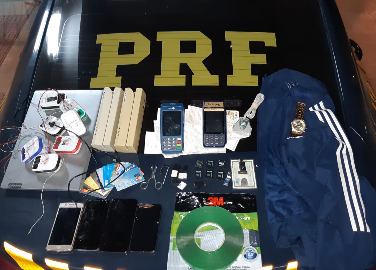 No veículo os policiais localizaram diversos equipamentos supostamente usados no episódio ocorrido na agência, além de 14 cartões e vários extratos bancários em nomes de terceiros, e uma lista contendo 45 (quarenta e cinco) números de CPF’s, com datas e descrição de valores provavelmente sacados em caixas eletrônicos. Com os envolvidos foi encontrado ainda um documento de identidade falsa.