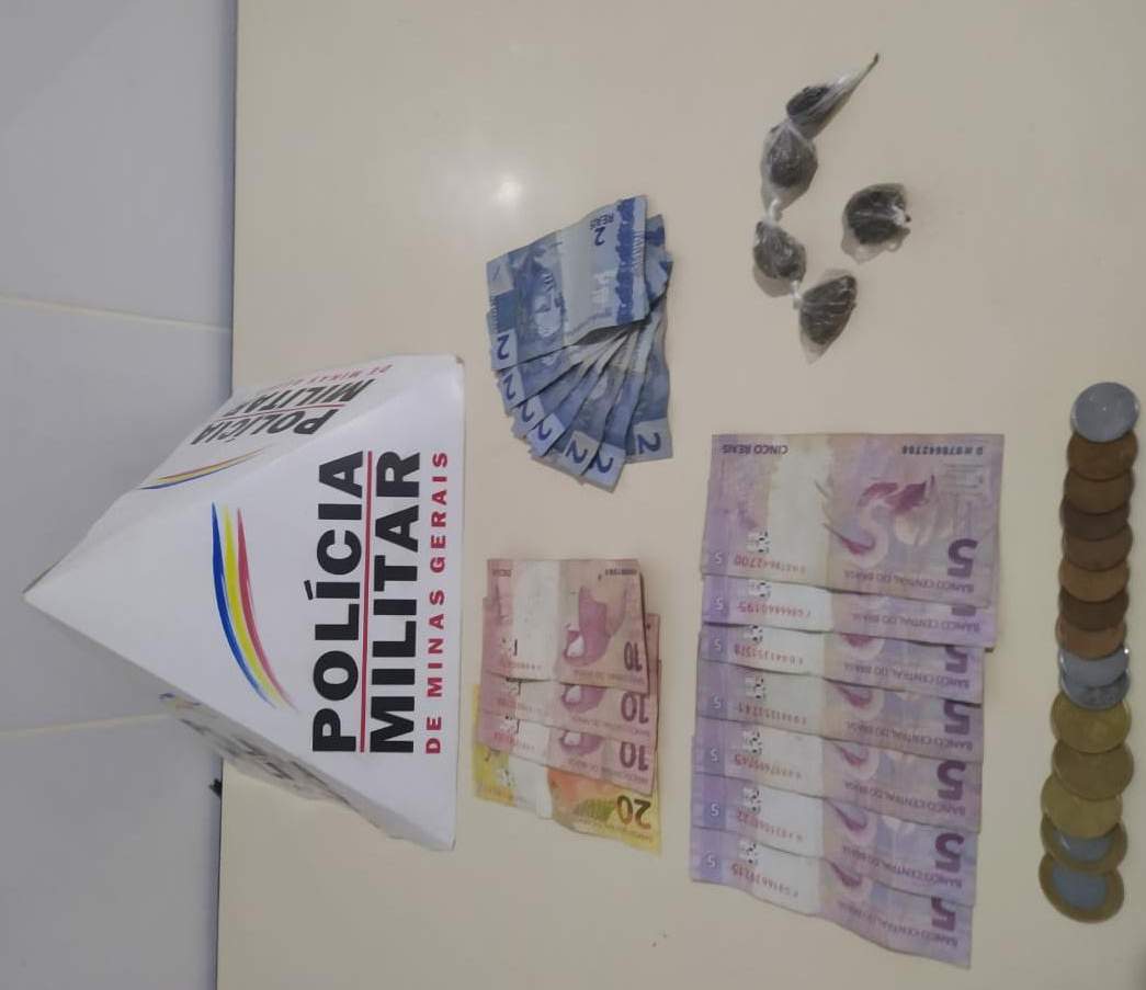 Durante as buscas, foram localizadas cinco buchas de maconha prontas para venda e R$ 102,35.